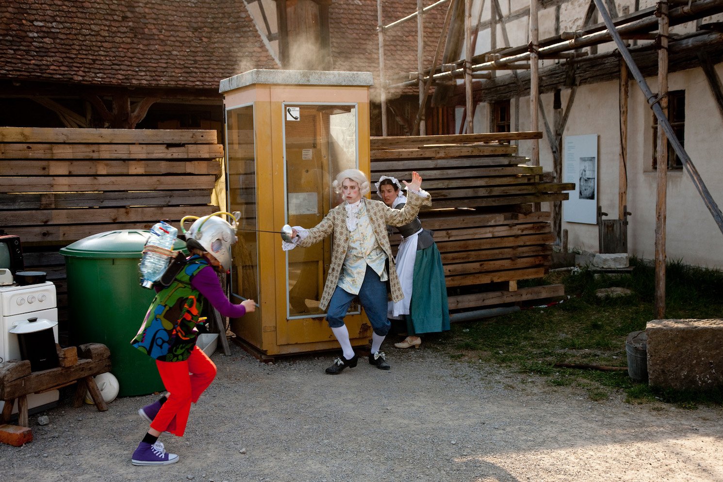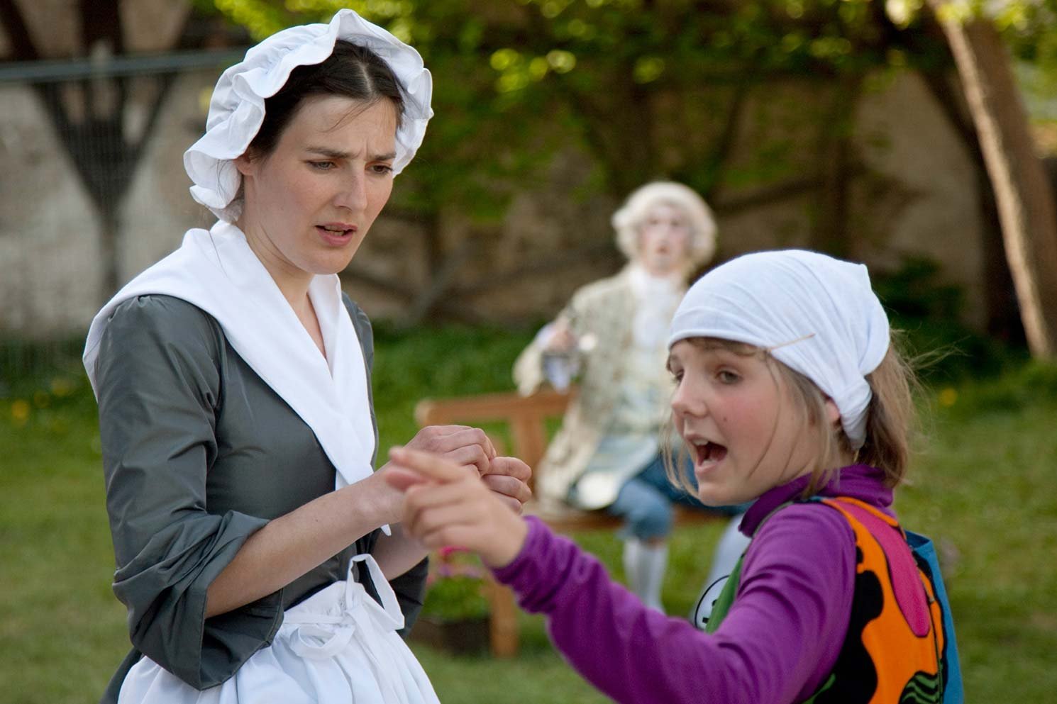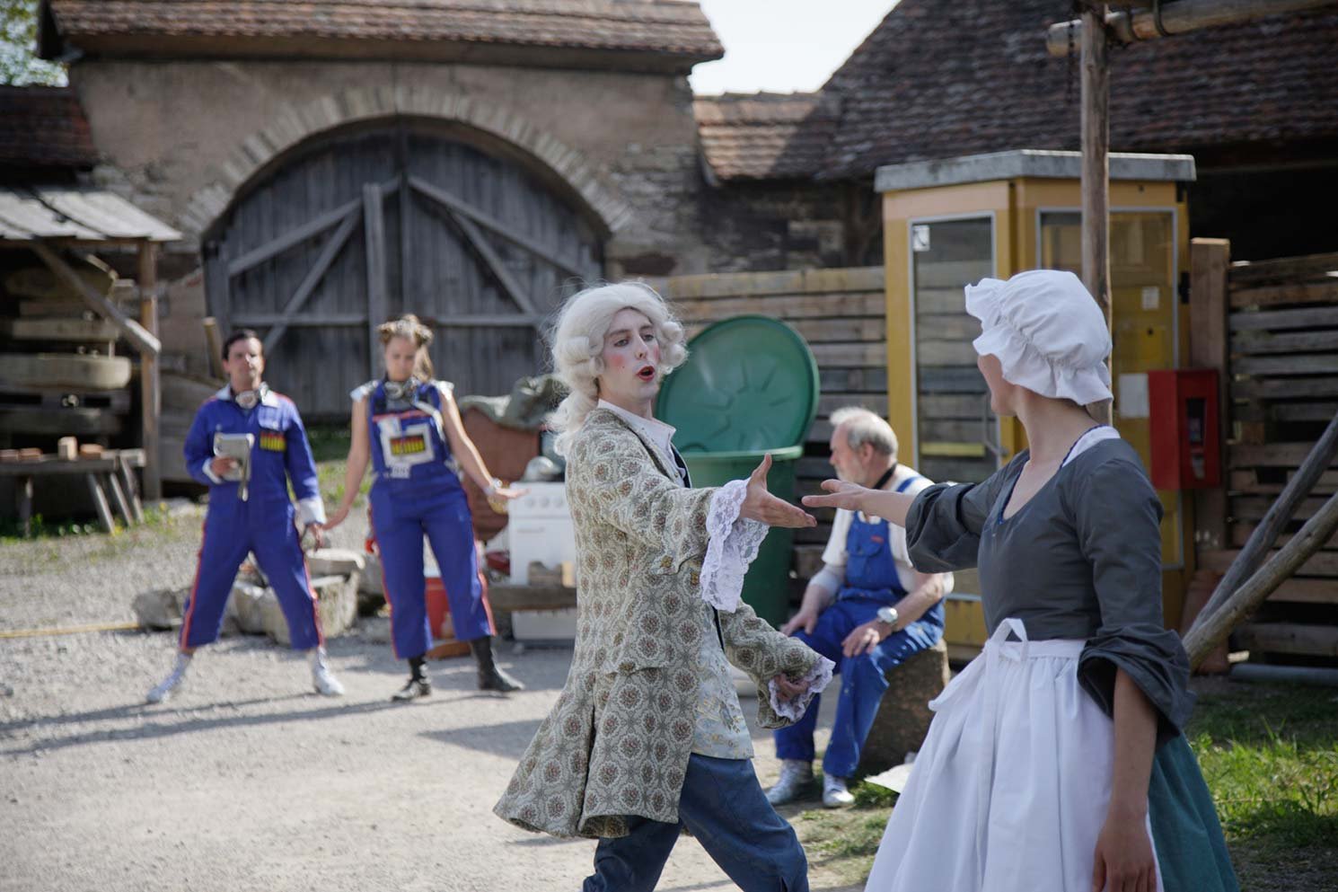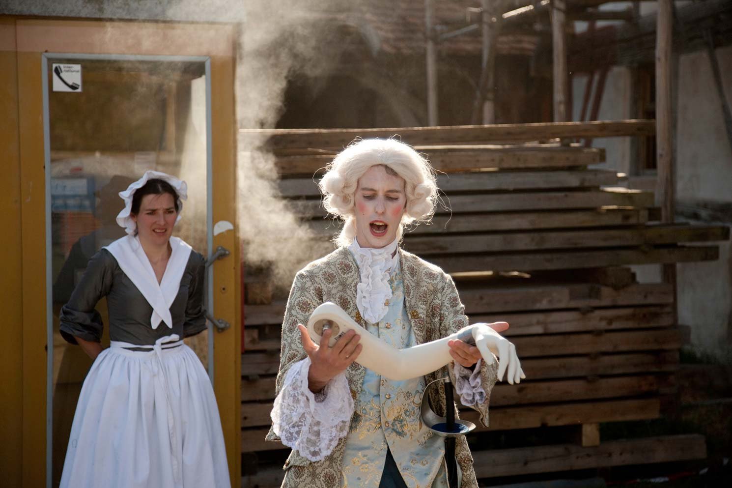 In der Produktion für Kinder ab sechs Jahren geht es um zwei Zeitreisende aus dem Rokoko, die durch ein Experiment im 20. Jahrhundert landen und dann ihre lieben Not damit haben, wieder in ihre Zeit zurück zu kommen.